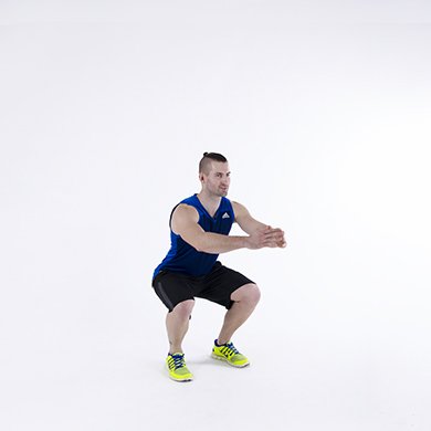 Wykonaj przysiad z zachowaniem kąta prostego w udach. Jednocześnie zrób wymach prostych ramion w przód jakbyś chciał/a klasnąć.