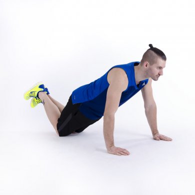 Ugnij łokcie tak by opaść klatką piersiową na podłożu. Napienając mięśnie wróć do pozycji wyjściowej.